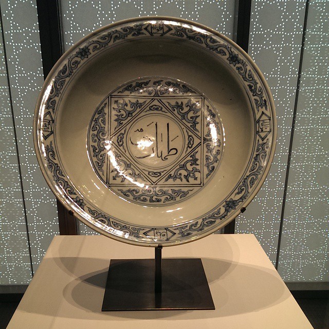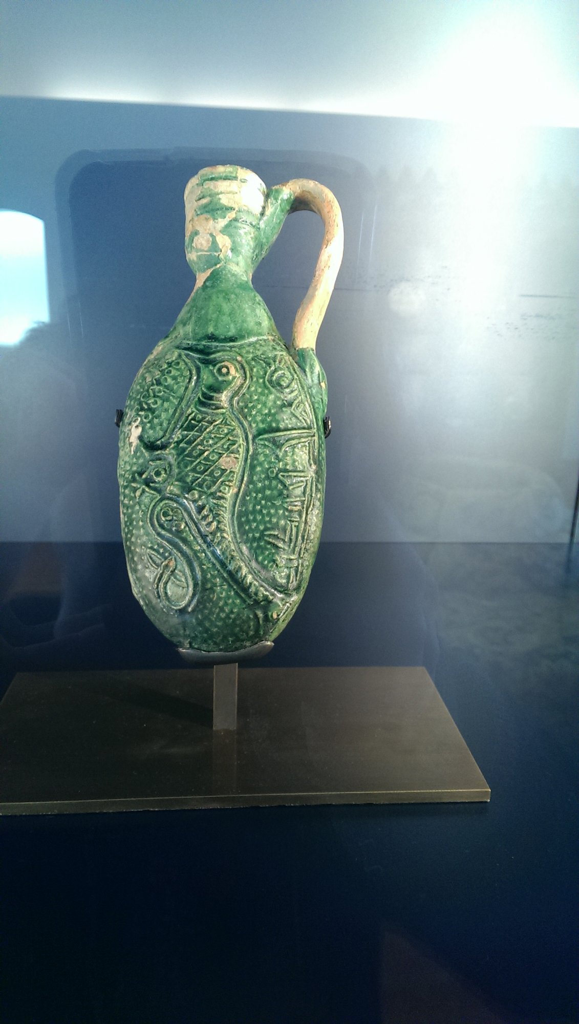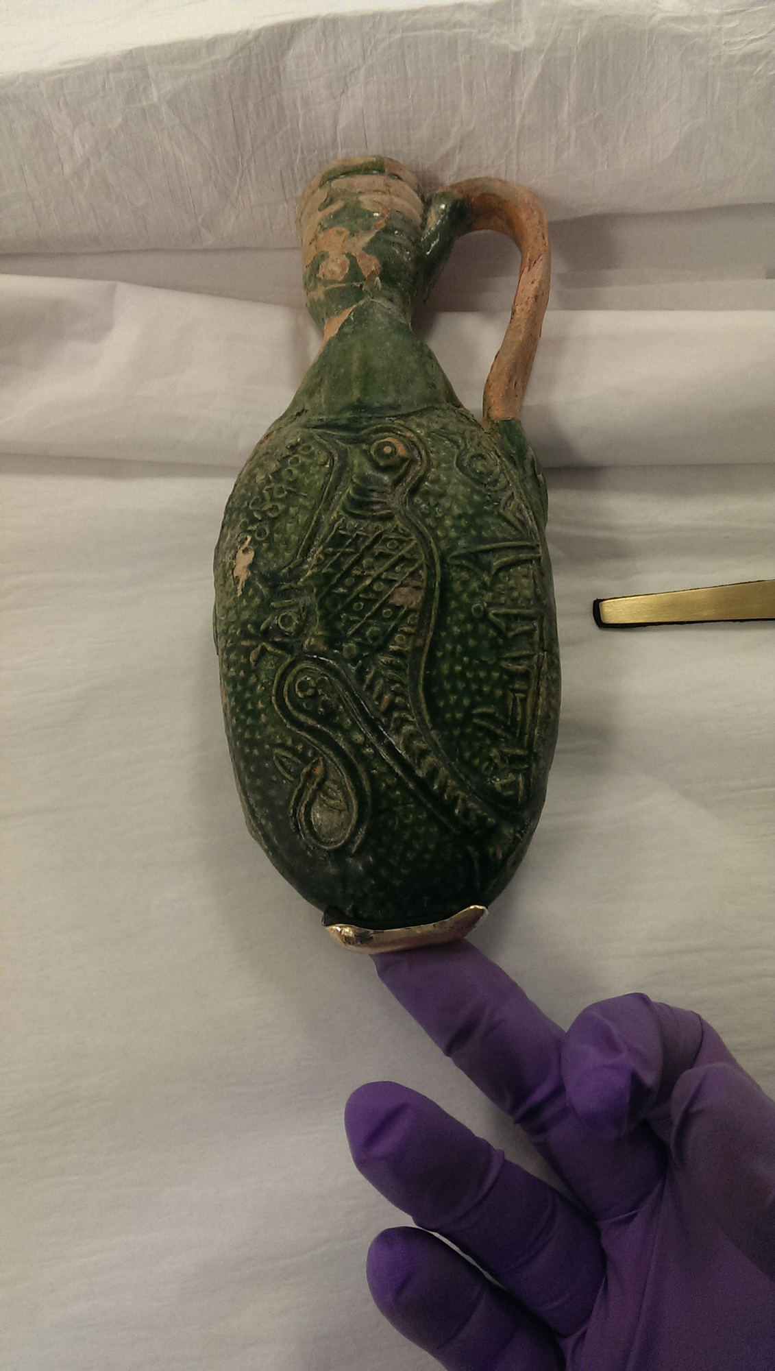 The turquoise Ewer (AKM540) was possibly a pilgrim flask that was made in Syria or Iran in the 9th century. It is an incredibly fragile artifact with raised and flaking glaze around the handle and neck. The Ewer has a distinct glaze drip on its bottom, opposite of the handle it was likely hung on to dry and fire. It was a bit of a puzzle to mount, as this glaze drip was simultaneously the most stable and most vulnerable point in the artifact. As you might imagine, it took a bit of considered smithing to match the complex geometry of its bottom.