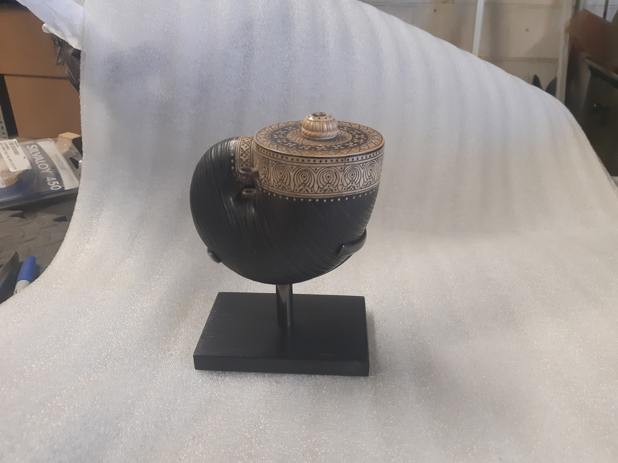 the silver mount was stylistically from England and dated 1620. At some point over the next 400 years, the silver talons mount became bent in such a way that would not allow it to rest securely for display, it was then my task to support it all, mostly invisibly, with a brass mount in 2018.